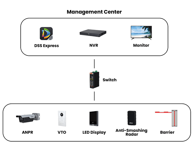 System Topology Description The solution features a centralized Management Center powered by DSS Pro Software for real-time monitoring and control. It utilizes a robust network topology where ANPR cameras, LED displays, VTO video intercoms, and barriers are interconnected via high-speed Switches. This architecture ensures seamless data transmission between the front-end capture devices and the back-end management system, supporting both automatic and manual verification modes for maximum security and efficiency.