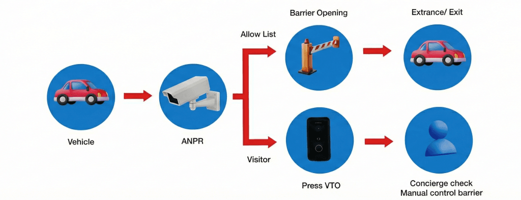 Authorized vehicles are detected by ANPR and granted automatic barrier access. Visitors press the VTO for manual identity verification, and the concierge opens the barrier upon approval.